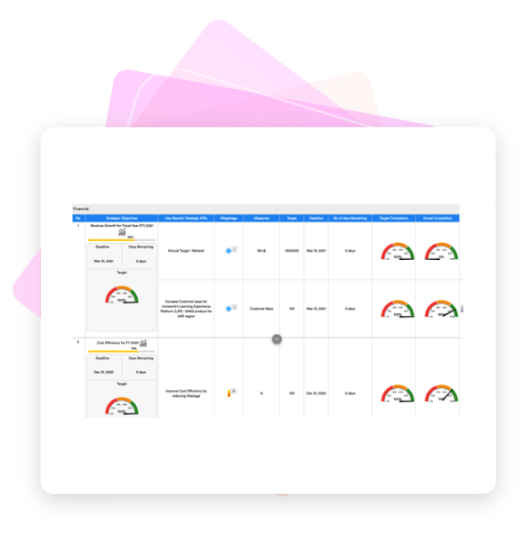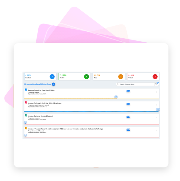Scorecards for the organizational level and operational levels. Monitor the Objectives and KPIs achievements dynamically.